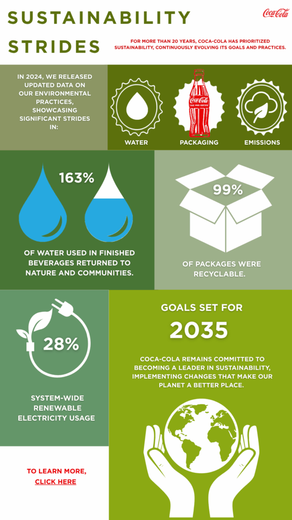 The goal of this infographic is to showcase how Coca-Cola’s commitment to sustainability extends beyond greenwashing or simple recycling. Using 2024 data, Coca-Cola demonstrates transparency and reinforces that since implementing its first carbon reduction commitments in 2006, sustainability has remained central to its strategy. Progressing in areas concerning water, packaging, and emissions, the brand displays how it continues to evaluate the ways in which it can do better, setting new goals for 2035.